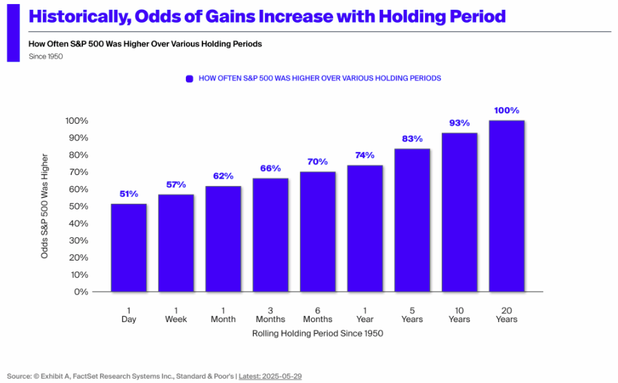 I say probably, because when looking back at historical data to 1950, the US market is higher on average 83% of the time 5 years later, 93% of the time 10 years later, and 100% of the time 20 years later.