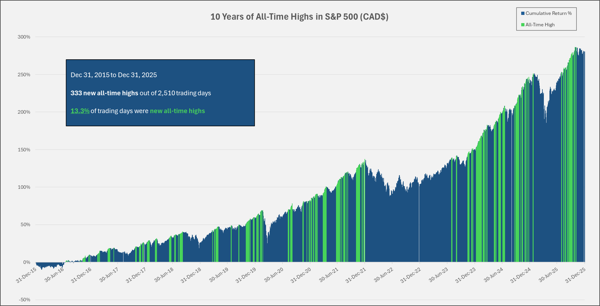 Over the past 10 years, the S&P 500 hit a new all-time high on 13.3% of trading days (333 out of 2,510 possible days)